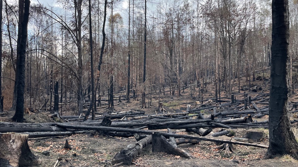 Hier sind die Spuren der Trockenheit nur allzu deutlich sichtbar. Gezeichnet durch die Waldbrände in diesem Sommer. Was aber bei der Menge Totholz in den Wäldern auch nicht wundert das es brennt wie Zunder.